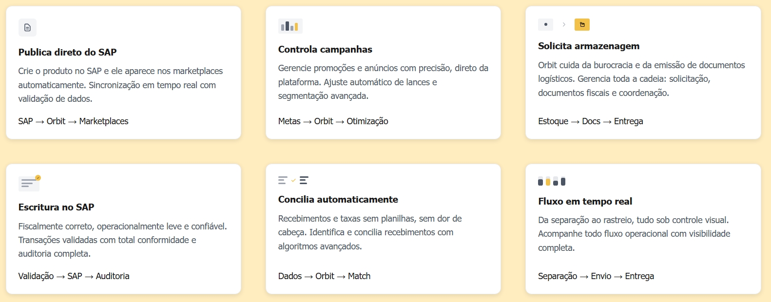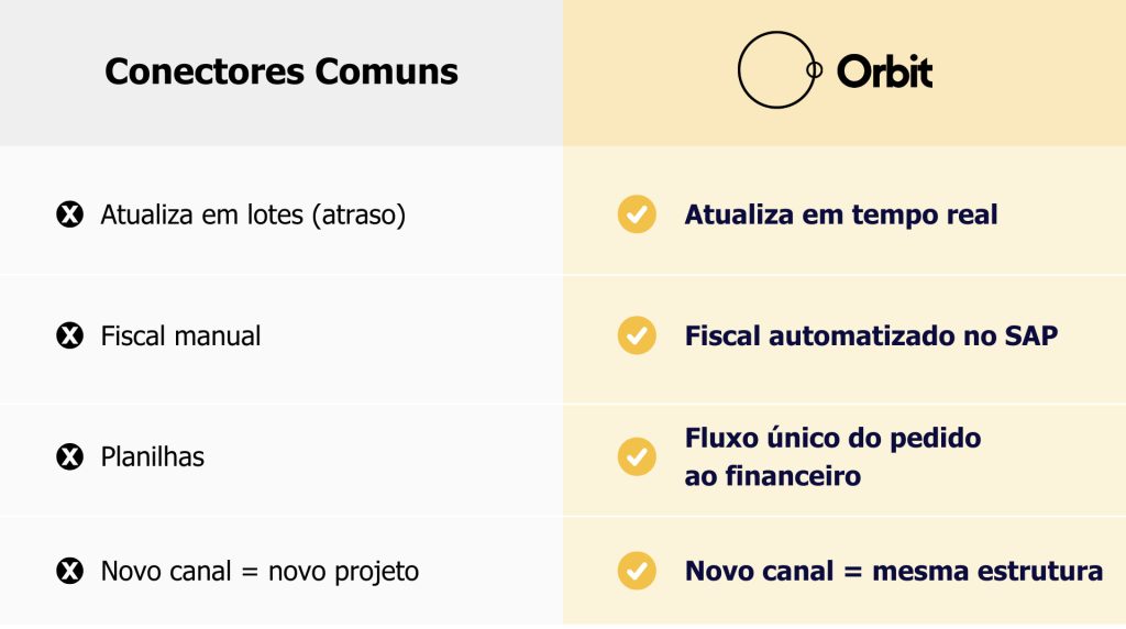 O Orbit é a camada que conecta SAP aos marketplaces e garante que tudo o que acontece fora do ERP seja validado, registrado e conciliado dentro dele.